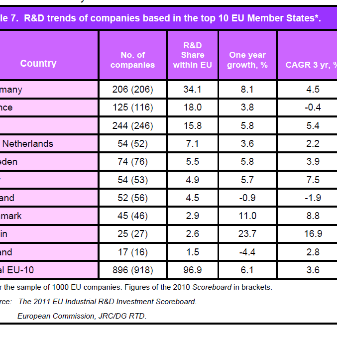 En él se dice que “las inversiones en I+D de las principales empresas de la UE experimentaron una fuerte recuperación en 2010, al aumentar un 6,1 % frente a la disminución del 2,6 % en 2009. No obstante, los datos correspondientes a las 1400 primeras empresas del mundo indican que las empresas de la UE en su conjunto se quedan atrás respecto a sus principales competidoras de los Estados Unidos y algunas economías asiáticas en crecimiento de la I+D.”