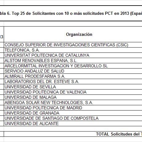 En España no hay un Top 25, solo hay un Top 16, y lo encabeza el CSIC con 68 solicitudes PCT, y ocupa la posición 320 del mundo. A continuación la siguen Telefonica (que es la 377 en el mundo) con 56 solicitudes, Universitat Politècnica de Catalunya (36 en el mundo) con 56, Alstom Renovables España y Arcelormittal Investigacion y Desarrollo ambas con 27 solicitudes PCT.