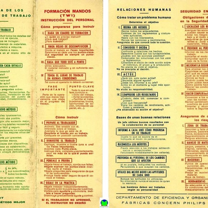 Ahora bien, es poco conocido que el programa Training within Industry también llegó a España en 1963 cuando el “Servicio Nacional de Productividad Industrial del Ministerio de Industria” convocó un “Concurso para formar Instructores en Formación de Mandos Intermedios”. Entre los profesionales que participaron y se certificaron como instructor se encontraba el ingeniero industrial Ramón Forn, quien posteriormente llegó a ser Director del Departamento de Organización y Eficiencia del Grupo Philips en España. Ramón me explicó cómo fue esa formación (se la dio un experto francés); y algunas de las frases que les recalcaron debían repetir cuando formasen a operarios, como la que decía “el hombre es el único animal que mejora los métodos y gracias a ello aumenta la productividad incesantemente”. Curiosamente el curso incorporaba un cuarto módulo de “Seguridad en el Trabajo” que no existía en el programa del TWI desarrollado en 1940.